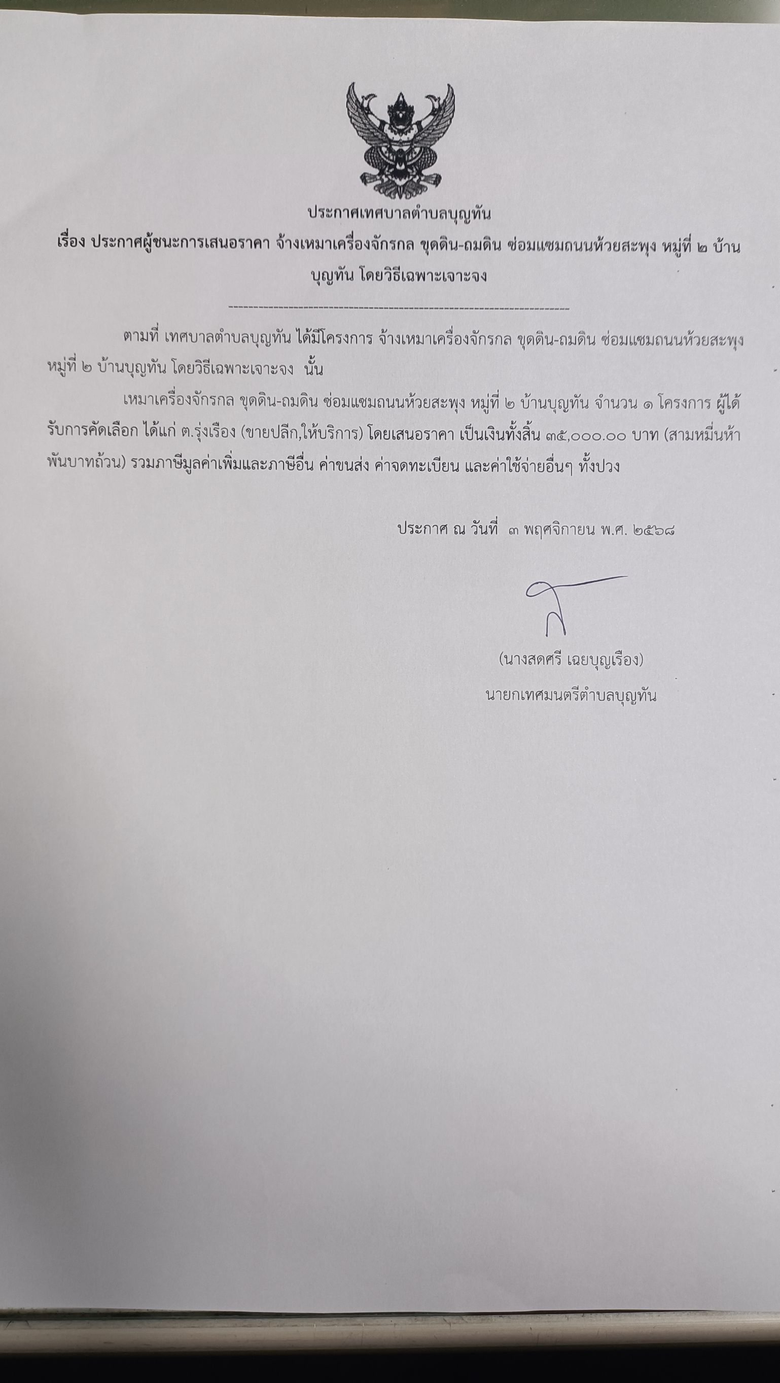 ประกาศ เทศบาลตำบลบุญทัน เรื่อง ประกาศการผู้ชนะการเสนอราคา ประกวดราคาจ...
