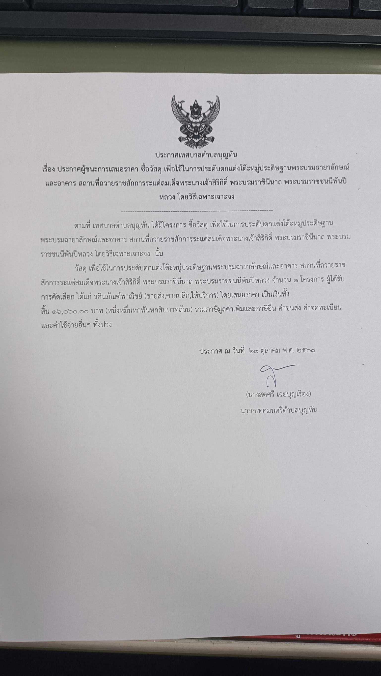ประกาศเทศบาลตำบลบุญทัน เรื่องประกาศผู้ชนะการเสนอราคา จ้างเหมาประดับต...