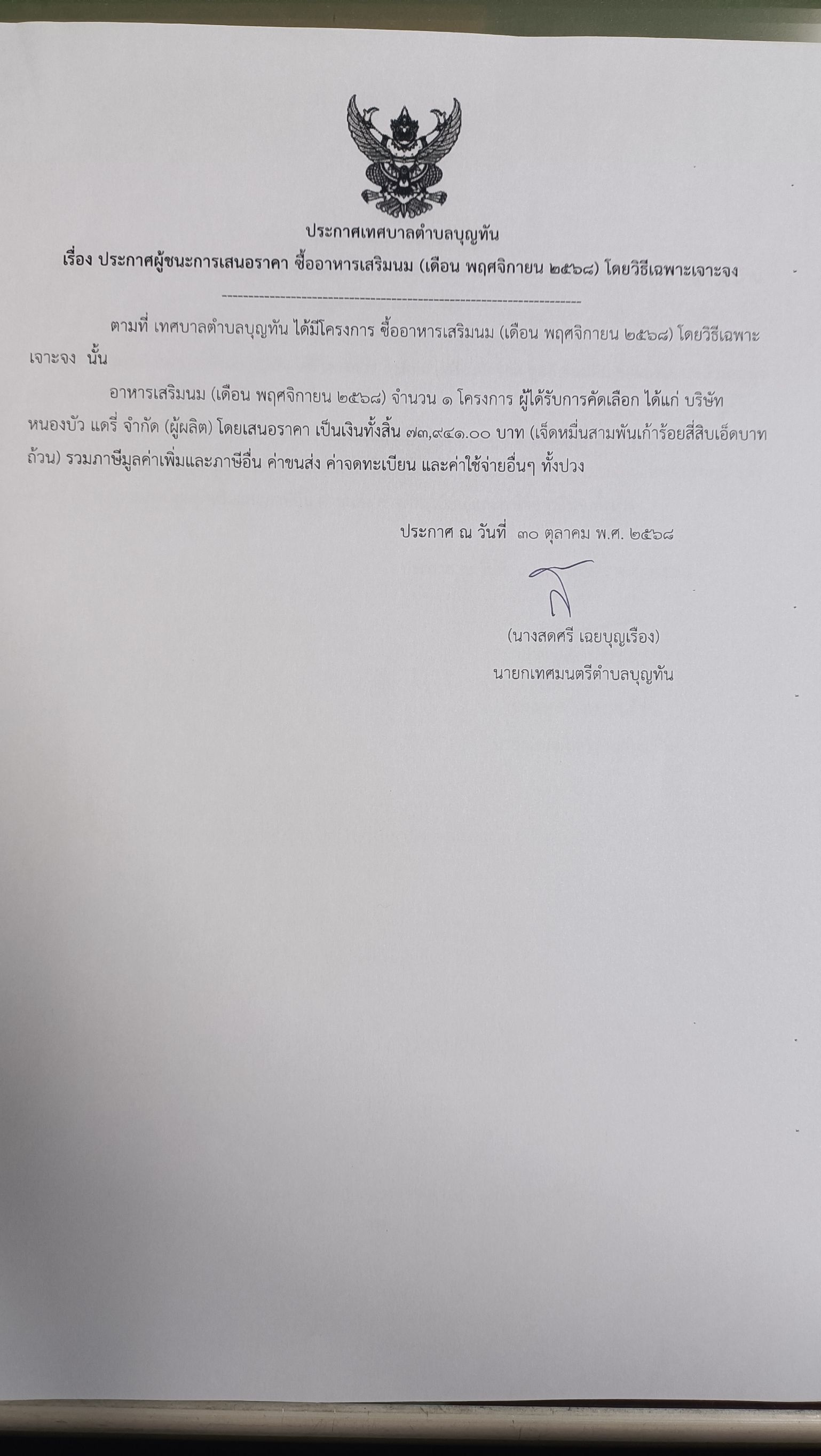 ประกาศเทศบาลตำบลบุญทัน เรื่องประกาศผู้ชนะการเสนอราคาซื้ออาหารเสริมนม (เดือนพฤศจิกายน 2568) โดยวิธีเฉพาะเจาะจง