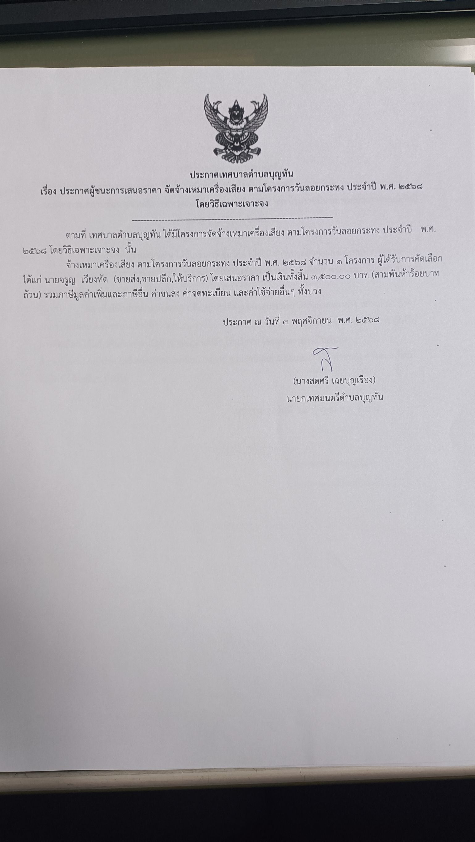 ประกาศเทศบาลตำบลบุญทัน เรื่องประกาศผู้ชนะการเสนอราคา จัดจ้างเหมาเครื่องเสียง ตามโครงการวันลอยกระทง ประจำปี พ.ศ. 2568 โดยวิธีเฉพาะเจาะจง