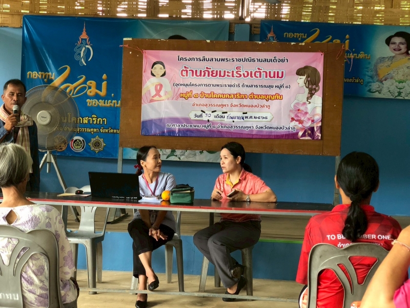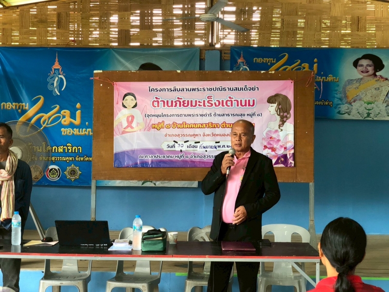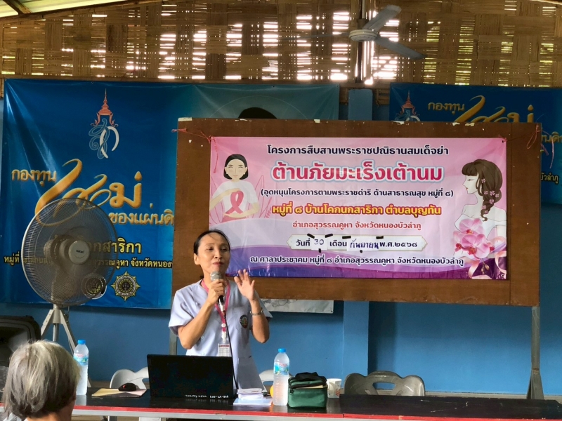 วันที่ 30 กันยายน 2568 นางสดศรี เฉยบุญเรือง นายกเทศมนตรีตำบลบุญทัน มอบหมายให้ นายอุดม จันทคูณ รองนายกเทศมนตรีตำบลบุญทัน เป็นประธานในพิธีเปิดโครงการสืบสานพระราชปณิธานสมเด็จย่า ต้านภัยมะเร็งเต้านม (อุดหนุนโครงการตามพระราชดำริ ด้านสาธารณสุข หมู่ที่ 8) เพื่อสืบสานเจตนารมฯของสมเด็จย่า โดยมีวัตถุประสงค์หลักในการให้ความรู้เกี่ยวกับมะเร็งเต้านม การสอนและกระตุ้นให้สตรีไทยเข้าตรวจเต้านมด้วยตนเองอย่างสม่ำเสมอ เฝ้าระวังและค้นพบมะเร็งเต้านมในระยะเริ่มต้น โดยมี คณะผู้บริหาร สมาชิกสภา ผู้นำชุมชนและประชาชนเข้าร่วมโครงการดังกล่าว ณ ศาลาประชาคม หมู่ที่ 8 ตำบลบุญทัน อำเภอสุวรรณคูหา จังหวัดหนองบัวลำภู