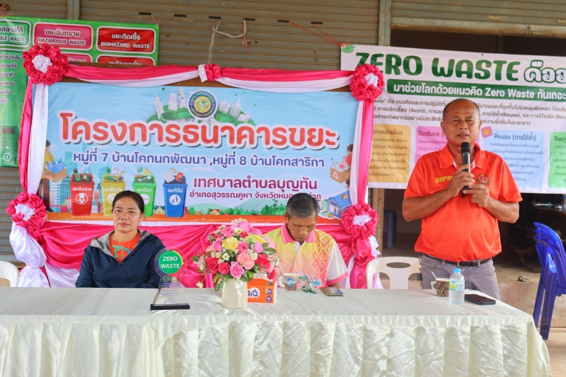 วันที่ 16 กันยายน 2568 นางสดศรี เฉยบุญเรือง นายกเทศมนตรีตำบลบุญทัน เป็นธานในพิธีเปิดโครงการธนาคารขยะ หมู่ที่ 7 บ้านโคกนกพัฒนา และหมู่ที่ 8 บ้านโคกนกสาริกา เพื่อประชาชนสามารถนำขยะที่คัดแยกแล้ว เช่น ขวดพลาสติก, กระดาษ, โลหะ, กระป๋อง ฯลฯ มาแลกเปลี่ยนเป็นเงิน เป้าหมายหลักคือการส่งเสริมให้คนในชุมชนมีส่วนร่วมในการแยกขยะและลดปริมาณขยะที่ถูกทิ้งโดยมีคณะผู้บริหาร สมาชิกสภา กำนัน ผู้ใหญ่บ้าน อสม ผู้นำชุมชน ณ ศาลประชาคมหมู่ที่ 7 บ้านโคกนกพัฒนา ตำบลบุญทัน อำเภอสุวรรณคูหา จังหวัดหนองบัวลำภู
