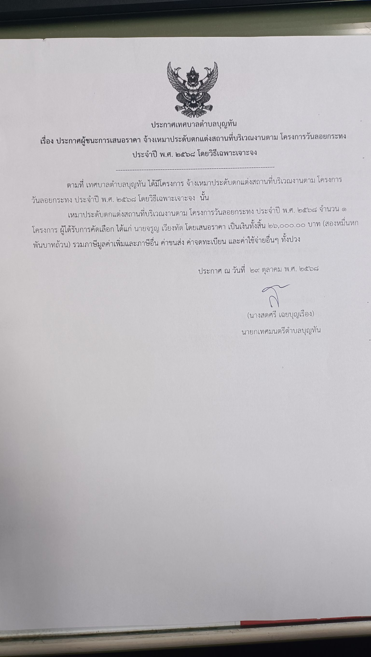 ประกาศเทศบาลตำบลบุญทัน เรื่องประกาศผู้ชนะการเสนอราคา จัดจ้างเหมาเครื่องเสียง ตามโครงการวันลอยกระทง ประจำปี พ.ศ. 2568 โดยวิธีเฉพาะเจาะจง