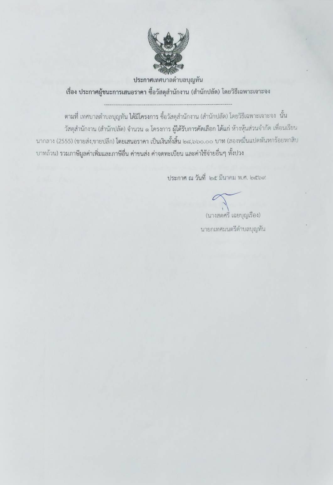 ประกาศเทศบาลตำบลบุญทัน เรื่องประกาศผู้ชนะการเสนอราคาซื้อวัสดุสำนักงาน(สำนักปลัด) โดยวิธีเฉพาะเจาะจง