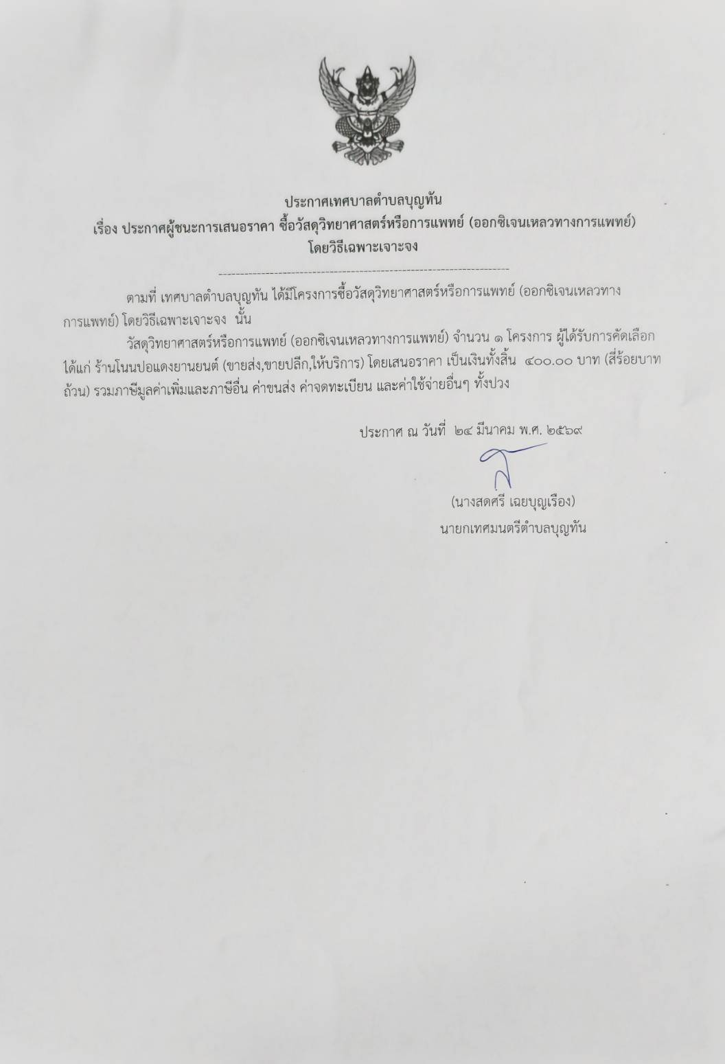 ประกาศเทศบาลตำบลบุญทัน เรื่องประกาศผู้ชนะการเสนอราคาซื้อวัสดุวิทยาศาสตร์หรือการแพทย์ (ออกซิเจนเหลวทางการแพทย์) โดยวิธีเฉพาะเจาะจง