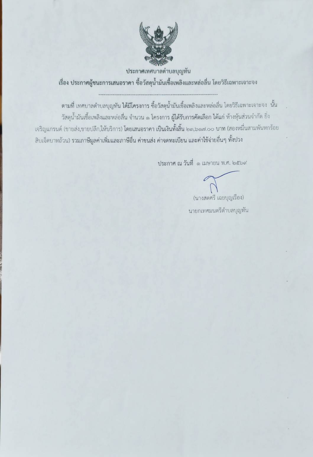 ประกาศเทศบาลตำบลบุญทัน เรื่องประกาศผู้ชนะการเสนอราคาซื้อวัสดุน้ำมันเชื้อเพลิงและหล่อลื่น โดยวิธีเฉพาะเจาะจง