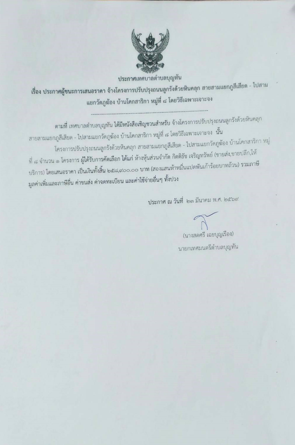 ประกาศเทศบาลตำบลบุญทัน เรื่องประกาศผู้ชนะการเสนอราคาจ้างโครงการปรับปรุงถนนลูกรังด้วยหินคลุก สายสามแยกภูสีเสียด-ไปสามแยกวัดภูฆ้อง บ้านโคกสาริกา หมู่ที่ ๘ โดยวิธีเฉพาะเจาะจง