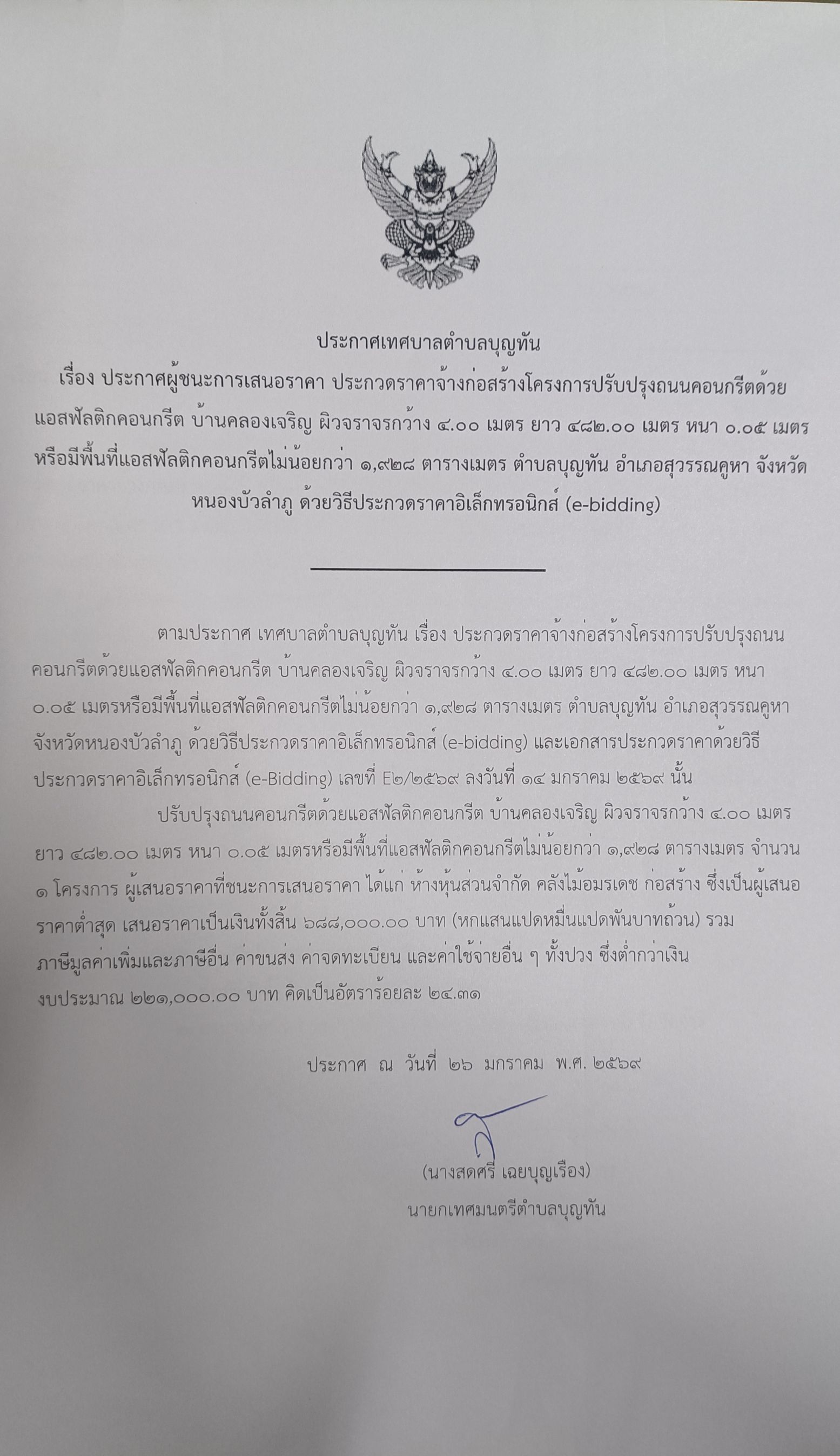 ประกาศเทศบาลตำบลบุญทันเรื่องประกาศผู้ชนะการเสนอราคาประกวดราคาจ้างก่อสร้างโครงการปรับปรุงถนนคอนกรีตด้วยแอสฟัลติกคอนกรีตบ้านคลองเจริญผิวจราจรกว้าง๔.00เมตร๔๘๒.00เมตรหนา0.0๕เมตรหรือมีพื้นที่แอสฟัลติกคอนกรีตไม่น้อยกว่า๑,๙๒๘ตารางเมตรตำบลบุญทันอำเภอสุวรรณคูหาจัง