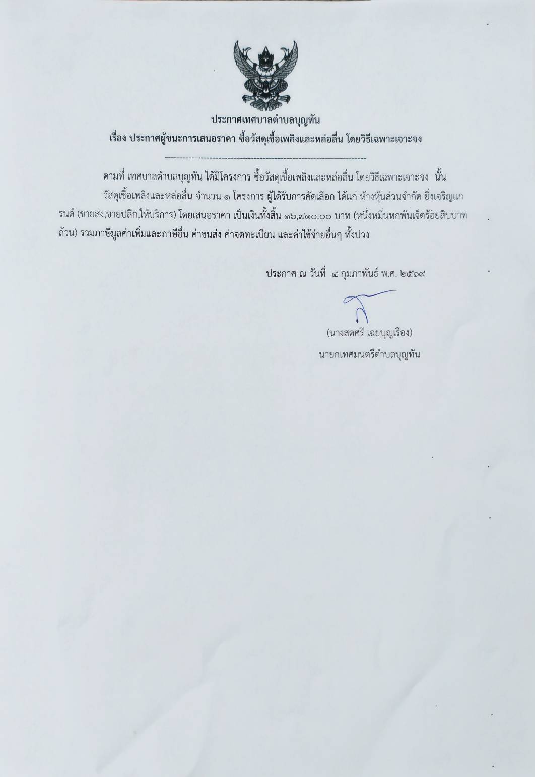 ประกาศเทศบาลตำบลบุญทันเรื่องประกาศผู้ชนะการเสนอราคาประกวดราคาจ้างก...