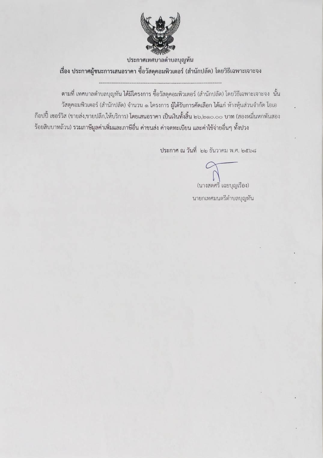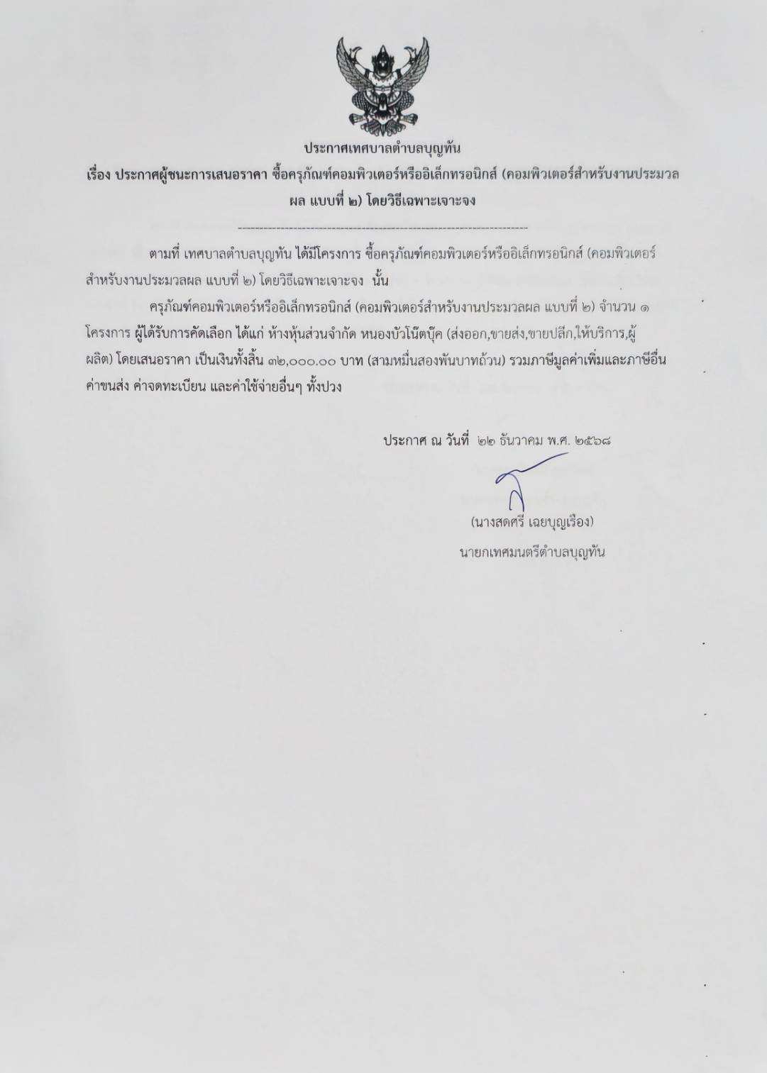 ประกาศเทศบาลตำบลบุญทัน เรื่องประกาศผู้ชนะการเสนอราคาซื้อครุภัณฑ์คอมพิวเตอร์หรืออิเล็กทรอนิกส์(เครื่องคอมพิวเตอร์โน๊ตบุ๊ก สำหรับงานประมวลผล) โดยวิธีเฉพาะเจาะจง