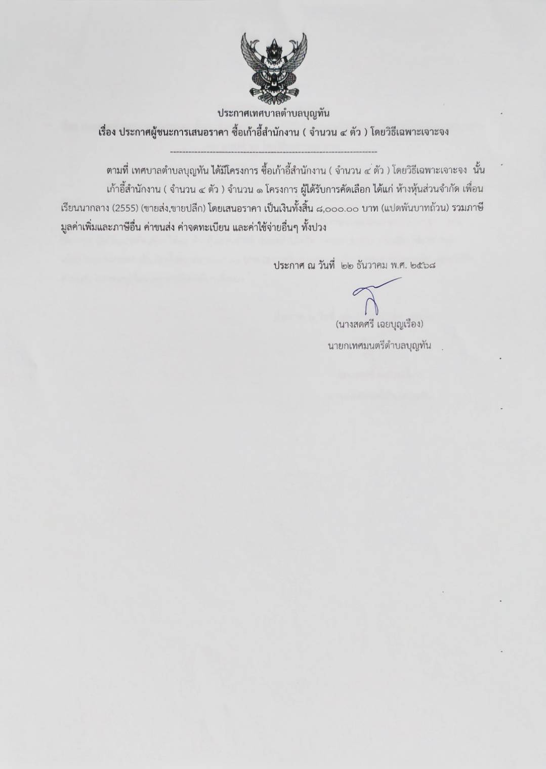 ประกาศเทศบาลตำบลบุญทัน เรื่องประกาศผู้ชนะการเสนอราคาซื้อเก้าอี้สำนักงาน(จำนวน ๔ ตัว) โดยวิธีเฉพาะเจาะจง