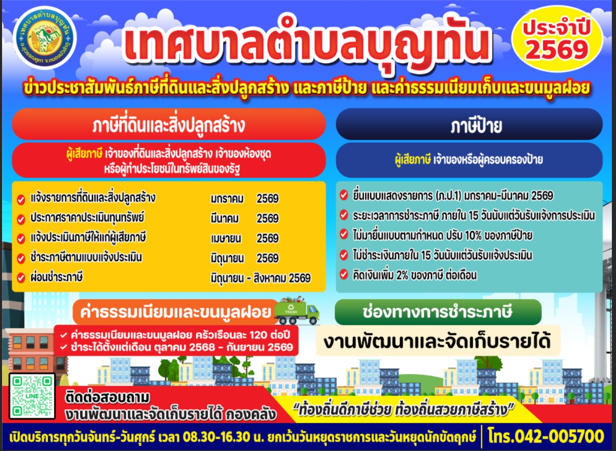 ประกาศเทศบาลตำบลบุญทัน เรื่องประกาศผู้ชนะการเสนอราคาจ้างทำป้ายไวนิลประชาสัมพันธ์ภาษีป้ายที่ดินและสิ่งปลูกสร้าง ภาษีป้ายและค่าธรรมเนียมต่างๆ โดยวิธีเฉพาะเจาะจง
