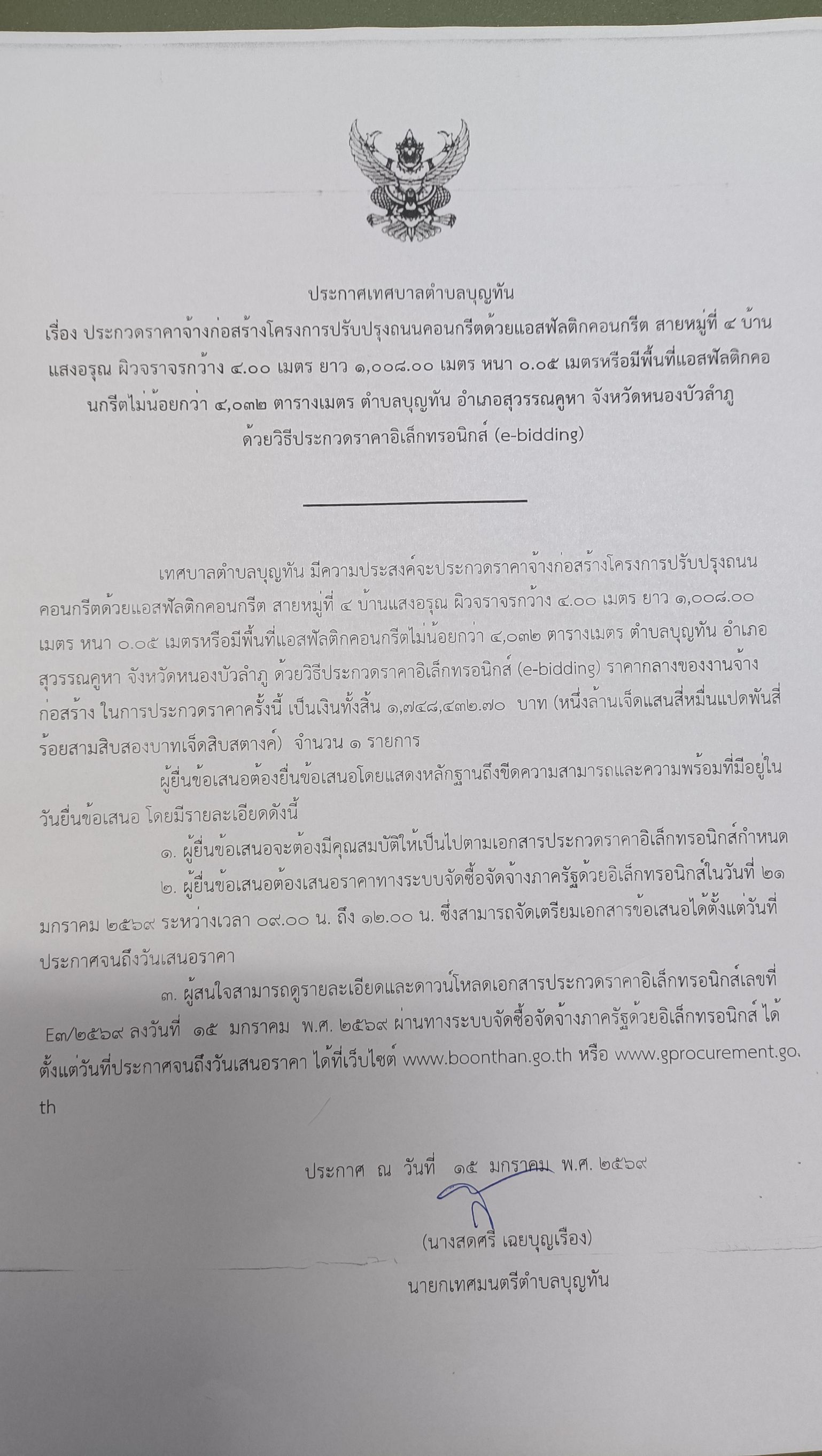 ประกาศเทศบาลตำบลบุญทัน เรื่องประกวดราคาจ้างก่อสร้างโครงการปรับปรุงถนนคอนกรีตด้วยแอสฟัลติกคอนกรีต สายหมู่ที่ ๔ บ้าน อรุณ ผิวจราจรกว้าง ๔.๐๐ เมตร ยาว ๑,๐๐๘.๐๐ เมตร หนา ๐.๐๕ เมตรหรือมีพื้นที่แ นกรีตไม่น้อยกว่า ๔,๐๓๒ ตารางเมตร ตำบลบุญทัน อำเภอสุวรรณคูหา จังหว