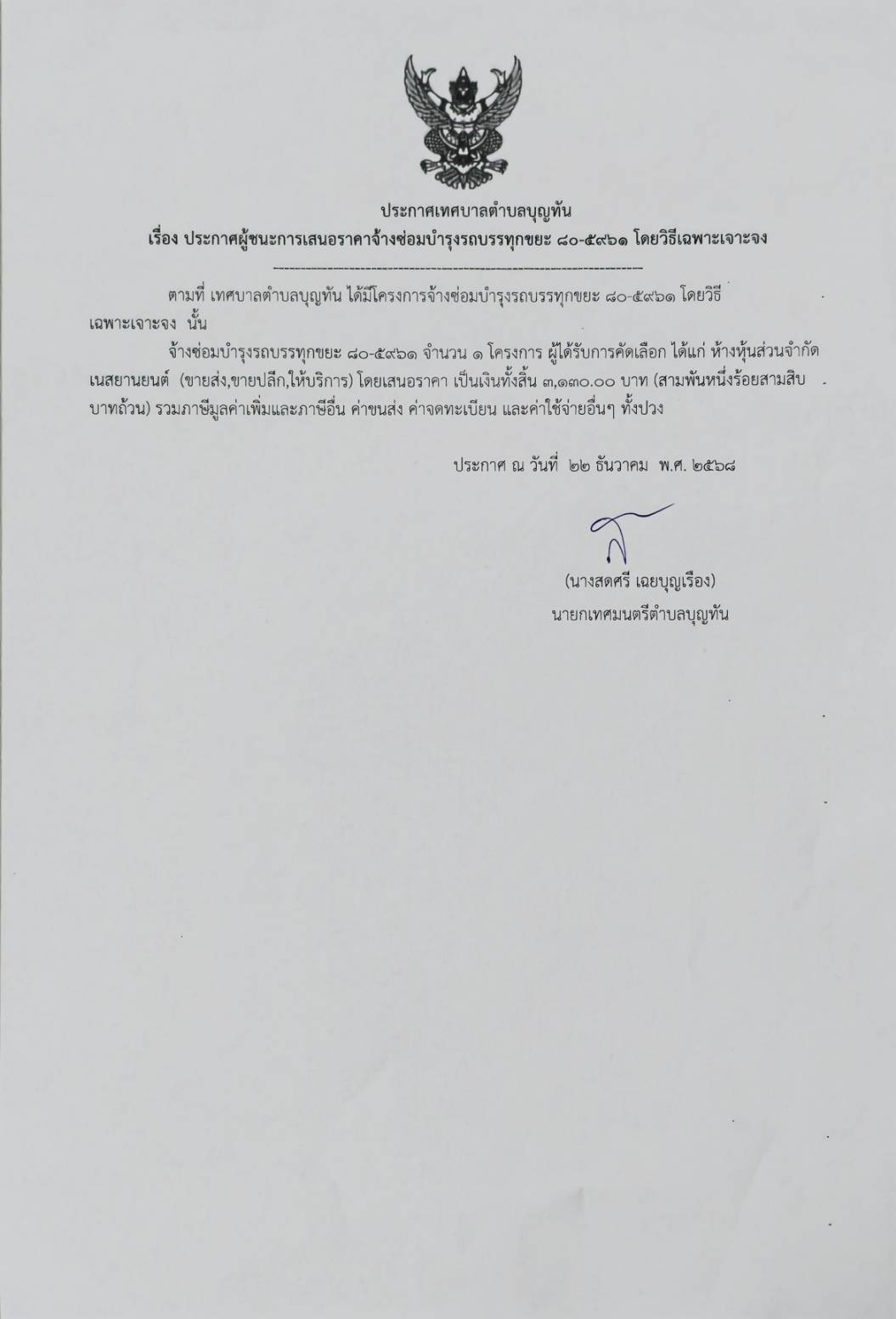 ประกาศเทศบาลตำบลบุญทัน เรื่องประกาศผู้ชนะการเสนอราคาจ้างซ่อมบำรุงรถบรรทุกขยะ ๘๐-๕๙๖๑ โดยวิธีเฉพาะเจาะจง
