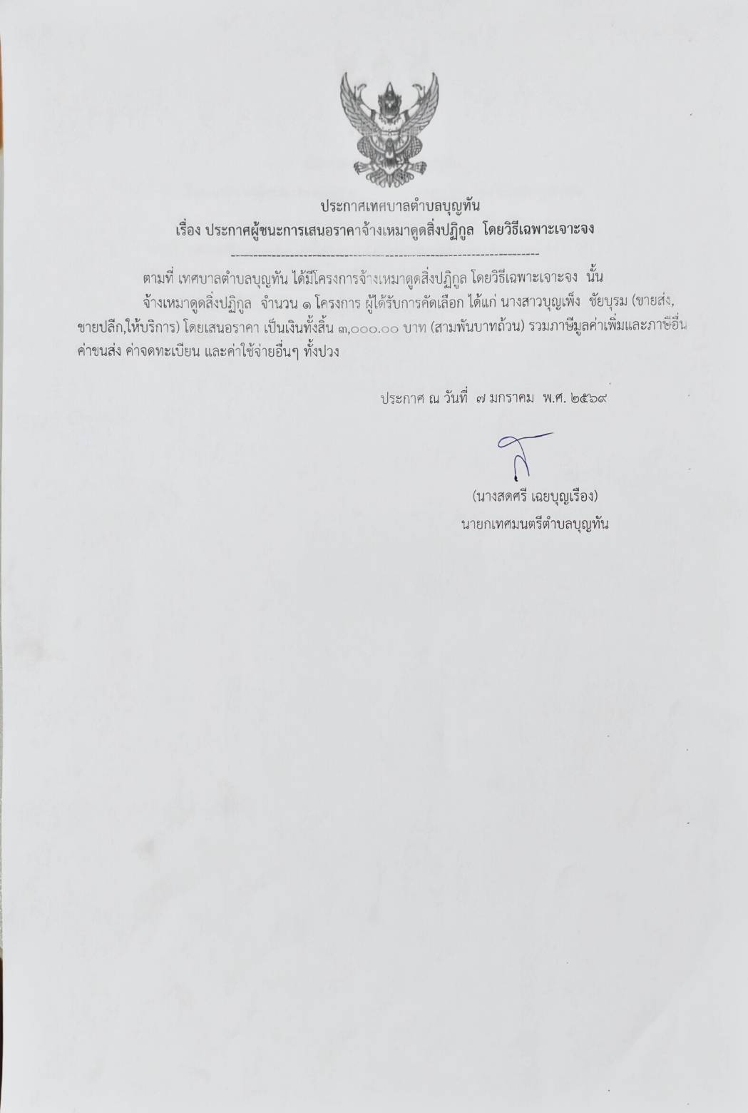 ประกาศเทศบาลตำบลบุญทัน เรื่องประกาศผู้ชนะการเสนอราคาจ้างเหมาดูดสิ่งปฏิกูล โดยวิธีเฉพาะเจาะจง