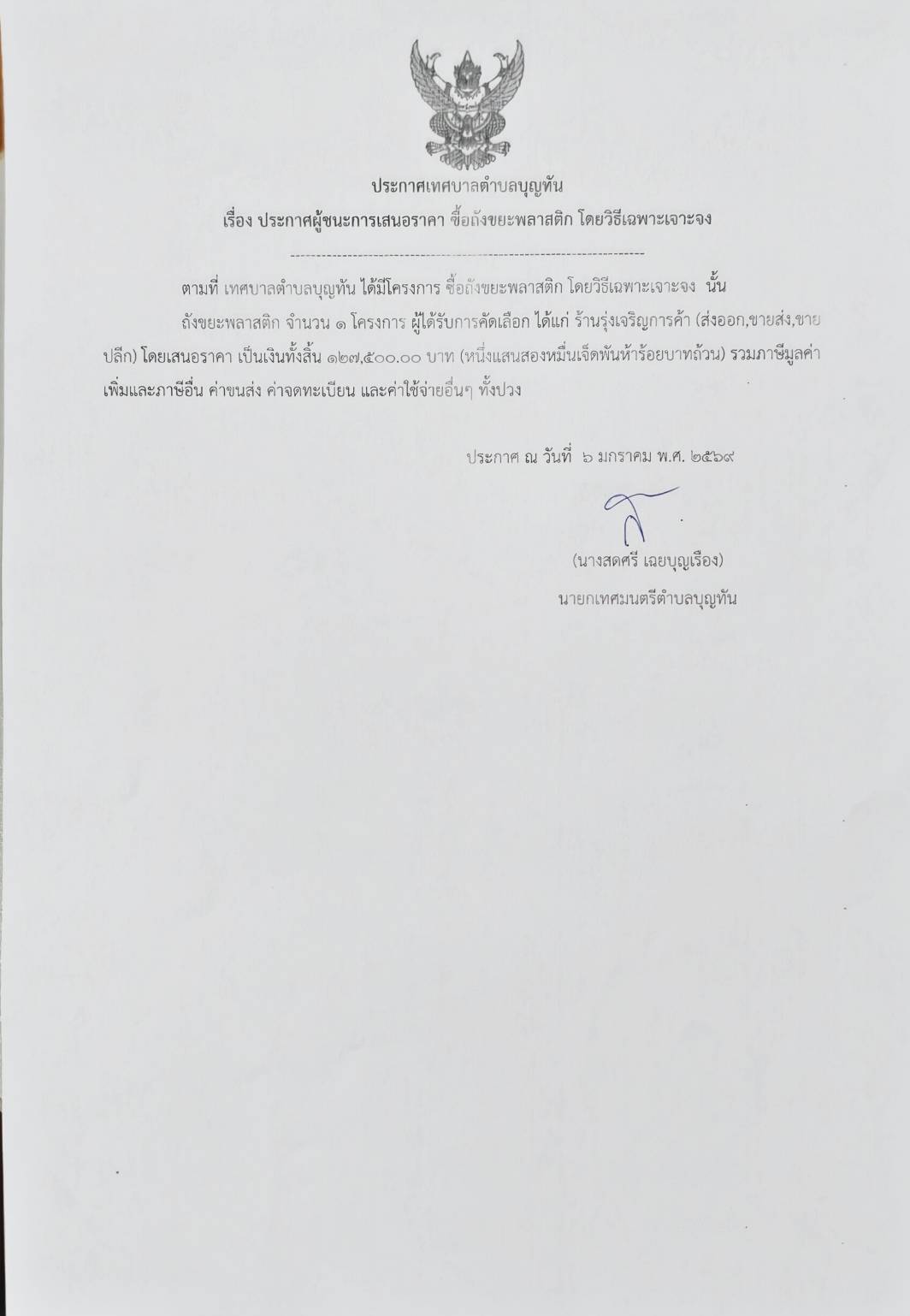 ประกาศเทศบาลตำบลบุญทัน เรื่องประกาศผู้ชนะการเสนอราคาซื้อถังขยะพลาสติก โดยวิธีเฉพาะเจาะจง