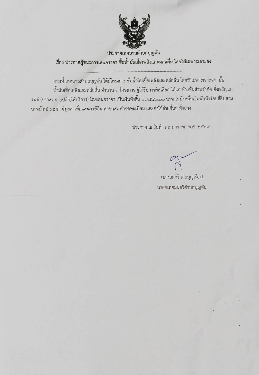 ประกาศเทศบาลตำบลบุญทัน เรื่องประกาศผู้ชนะการเสนอราคาซื้อน้ำมันเชื้อ...